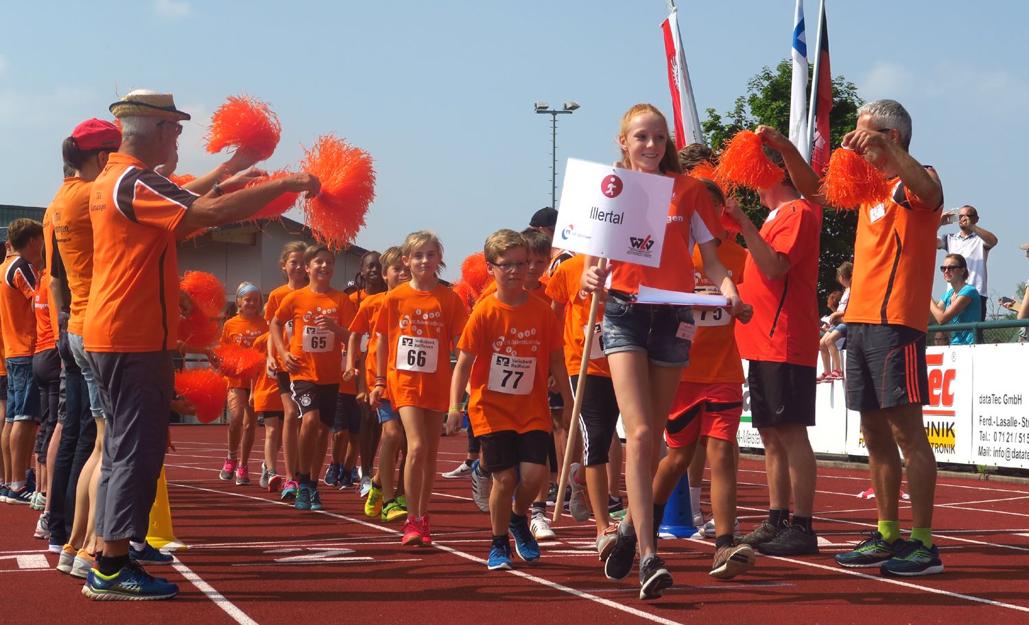 Beim Einmarsch durch das Spalier der Gomaringer Helfer, unter denen auch einige Topathleten, wie Gianni Seeger oder Karolin Sauer waren, fühlten sich die Kinder „richtig prominent“, wie eins der Mädchen beeindruckt äußerte. Eine kurze Begrüßung durch Bürgermeister Steffen Hess, ein fetziges Aufwärmprogramm mit Alexander Seeger und schon ging es an die Stationen, die im Rundlauf in einer Stunde absolviert wurden: 20 m-Sprint, 40 m-Hürdensprint, Weitsprung und Heulerballwurf wurden von den 9 Teams ohne große Wartezeiten durchlaufen, und auch die anschließenden stimmungsvollen Staffelläufe gingen reibungslos vonstatten. Nach drei Stunden war sogar schon die Siegerehrung durch, die vom Marketingleiter der Volksbank Tübingen, Alexander Pahl, und vom Jugendwettkampfwart des WLV, Johannes Lohrer, durchgeführt wurde. Für die große und großzügige Unterstützung durch den Sponsor Volks- und Raiffeisenbanken, die Gemeinde Gomaringen und den örtlichen TSV sei an dieser Stelle nochmals ein herzliches Dankeschön gesagt.