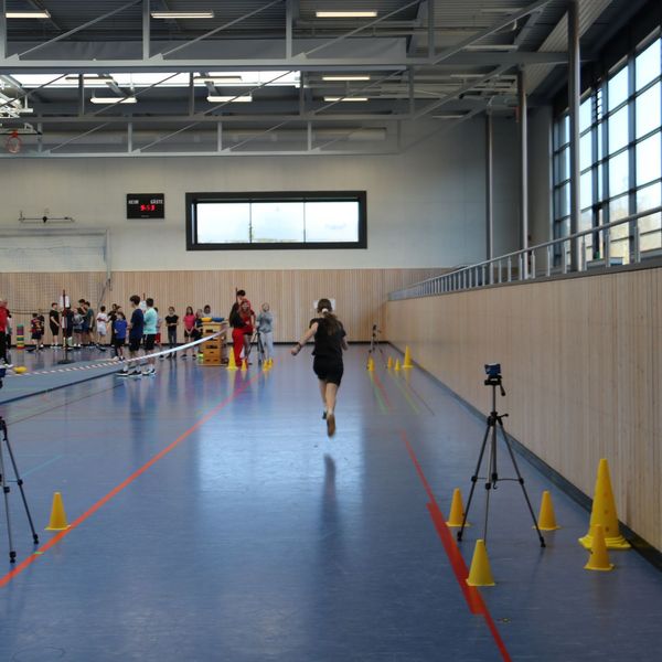 Mit dabei war auch Top-Athlet Silas Rammhofer (Unterländer LG), der das ein oder andere Mal zum Sprint-Duell an der Station „Lightning Speed“ herausgefordert wurde. An dieser Station haben die Schüler:innen die Aufgabe, so schnell wie möglich eine gerade Strecke von 20 Metern zurückzulegen. Ihre Zeit wird mithilfe einer Zeitmessanlage ermittelt, wobei zwei Zeitmessschranken (eine am Anfang der 20 Meter-Strecke, eine am Ende) durchlaufen werden müssen.